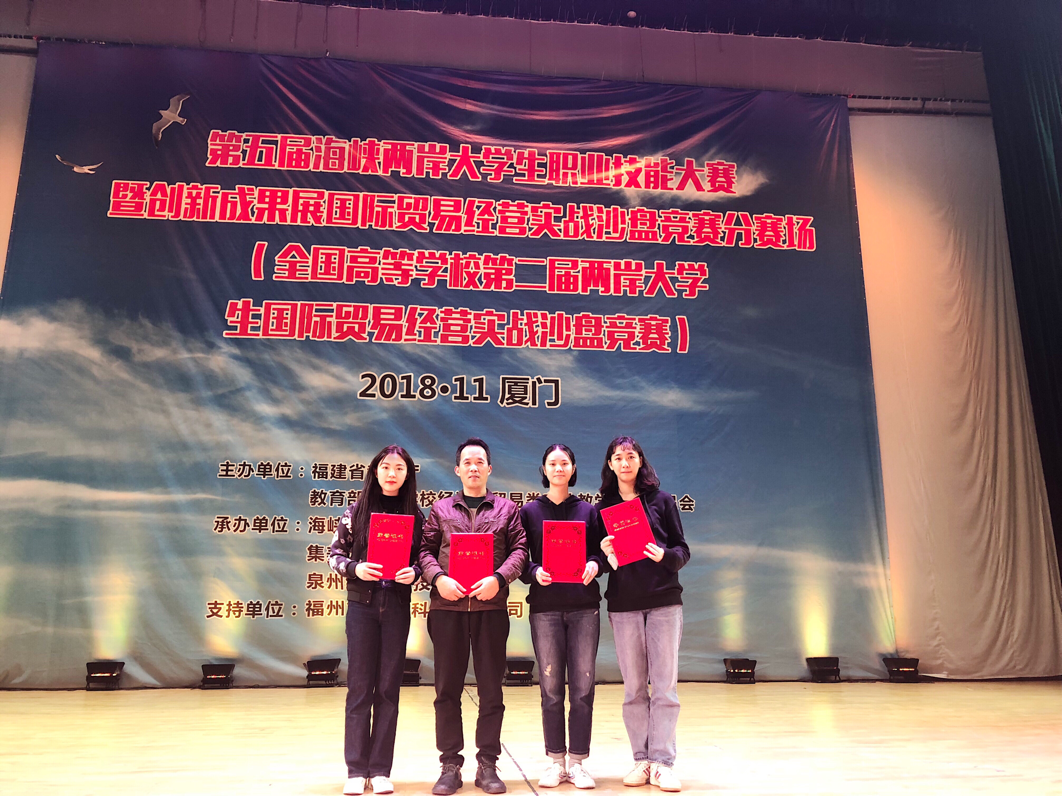11月24日上午,由教育部高等学校经济与贸易类专业教学指导委员会和福建省教育厅联合主办的“全国高等学校第二届两岸大学生国际贸易经营实战沙盘竞赛”在集美大学开幕。我院2016级国贸专业黄璇、王丽、翁丹琳、夏雅茹、陈明义等五位同学组成的参赛队伍荣获三等奖,这也是我院学生首次组队参赛并获奖,该队伍由我院聂清华老师指导、黄辉老师带队。