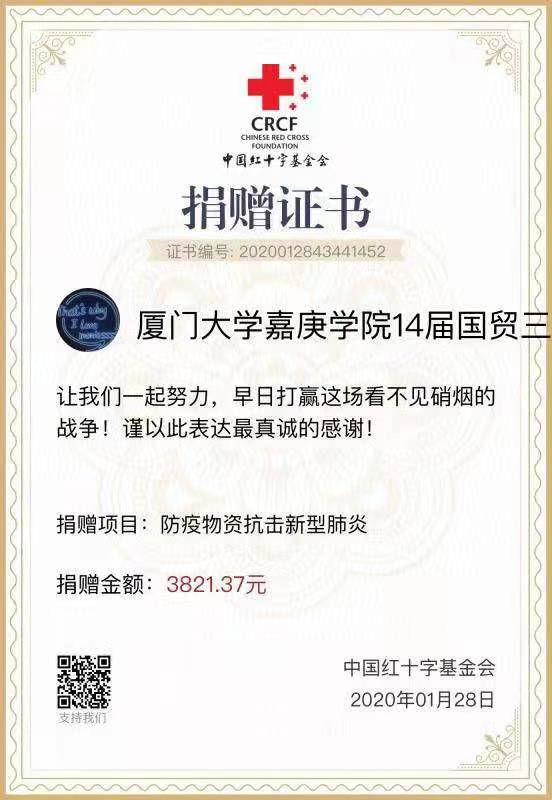 新型冠状病毒引发的肺炎疫情牵动所有人的心。厦门大学嘉庚学院国际商务学院2014届国贸三班的同学们自发组织捐款,截止至2020年1月28日,共筹集到29位同学共计3821.37元的款项,捐款完成当天已捐赠给中国红十字基金会。他们在捐赠证书上这么说:“让我们一起努力,早日打赢这场看不见硝烟的战争吧!”
