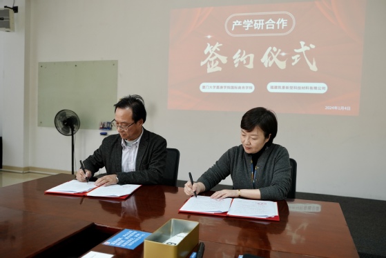 1月4日,厦门大学嘉庚学院国际商务学院与福建凯景新型科技材料有限公司于福建凯景新型科技材料有限公司会议室签订了产学研合作基地协议,并举办了产学研合作基地揭牌仪式。国际商务学院院长苏锦俊,福建凯景新型科技材料有限公司营业部副总邱红星、市场部经理吴秀艺、国际商务学院中小企业发展研究中心主任郑文坚、办公室主任朱郑雯等到场参加。