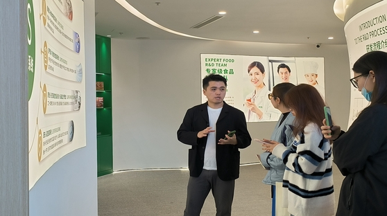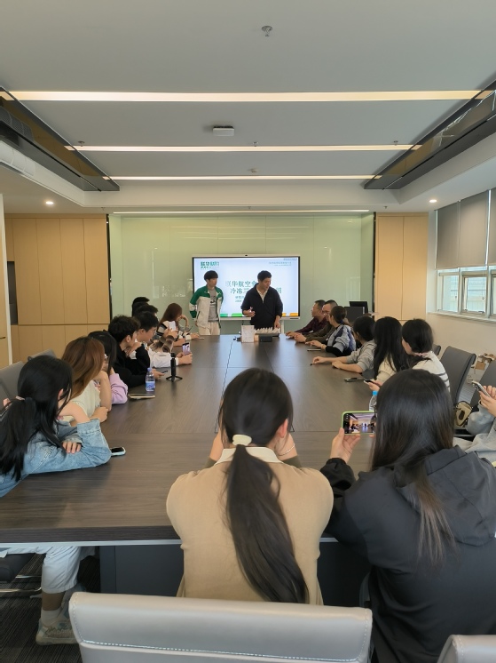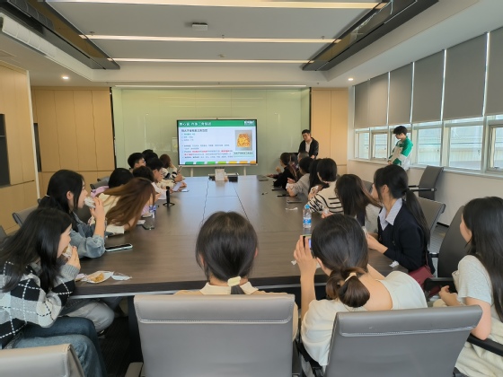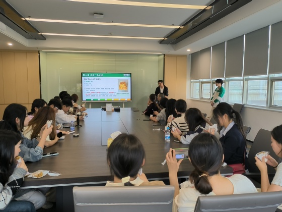 为了让大家有联华膳阶的产品有更深入、全面的了解,研发部罗经理在会议室为老师和同学们带来了一场精彩绝伦的讲解。其中,新品饭团的介绍环节尤为引人入胜,通过丰富详实的 PPT 展示,大家对新品的创意理念、原料选材、制作工艺等有了透彻的认识。随后,工作人员呈上精心准备的新品试吃。品尝着美味的饭团,老师和同学们不仅大饱口福,更获得了直观而实际的体验感,对企业产品有了更深层次的感悟。