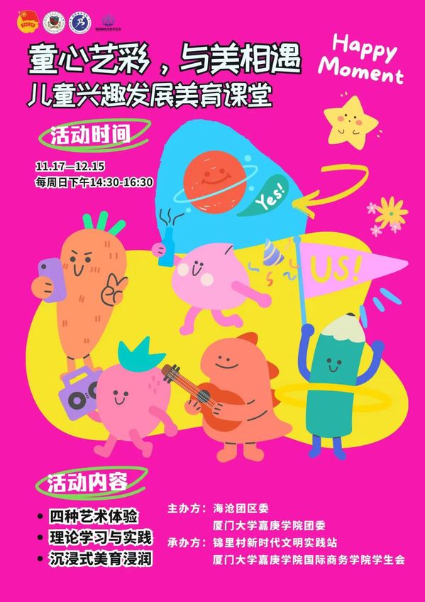 第四期“海沧区社区治理大学生帮帮团”即将开启,国际商务学院学生会将重点从“美育”转向“兴趣”,继续将“童心艺彩,与美相遇”儿童兴趣发展课堂带入锦里村!与锦里村的小朋友携手并肩发现属于我们每个人的“闪光点”!