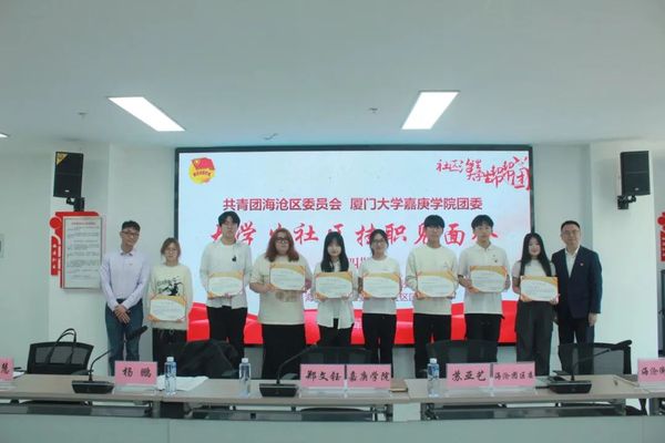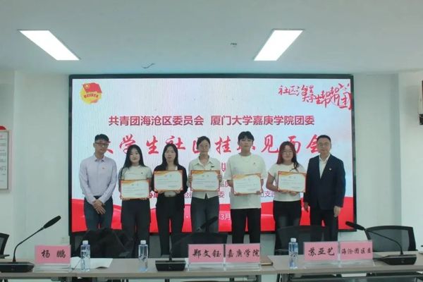 2025年3月26日上午海沧团区委联合厦门大学嘉庚学院团委开展“海沧区社区治理大学生帮帮团”项目合作暨第四期大学生职业体验见面会。经过社区-街道-区三级考核评估,我院“童心艺彩,与美相遇”儿童兴趣发展美育课堂入选金牌项目!项目负责人张欣玥(海沧街道团工委书记助理)获评优秀挂职干部!