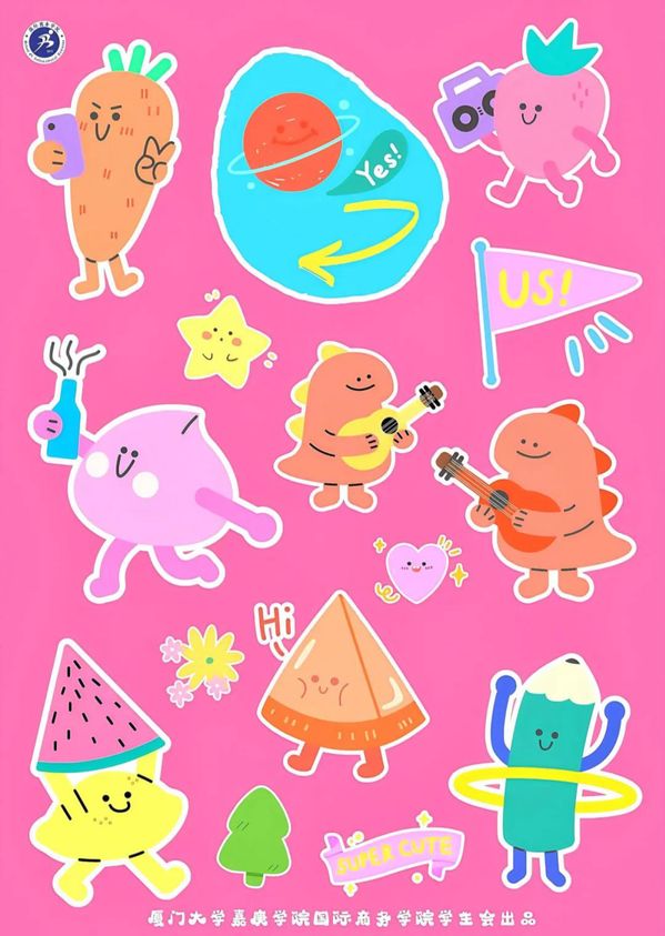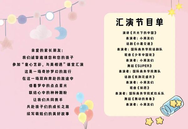 国际商务学院学生会结合“童心艺彩,与美相遇”儿童兴趣发展美育课堂的特色,设计了课程海报、贴纸和汇演节目单,收获许多小朋友及家长的喜爱。