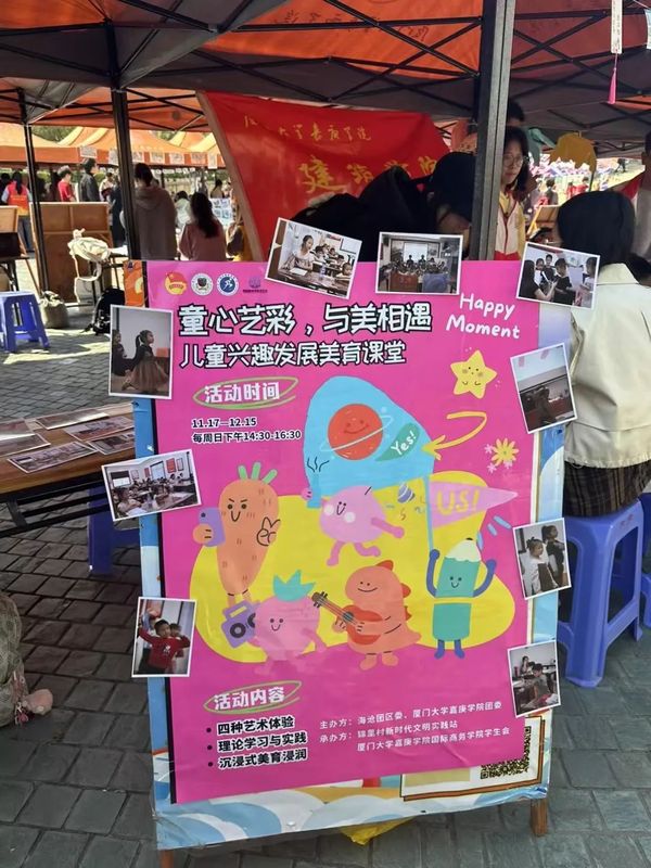 2024年10月,海沧团区委与厦门大学嘉庚学院团委开启“海沧区社区治理大学生帮帮团”第三期合作,国际商务学院学生会将“童心艺彩,与美相遇”儿童兴趣发展美育课堂带进厦门市海沧区锦里村,以“向美而行,以美育人”为理念开展了话剧、舞蹈、音乐与演讲四节课程,以及一场汇演。