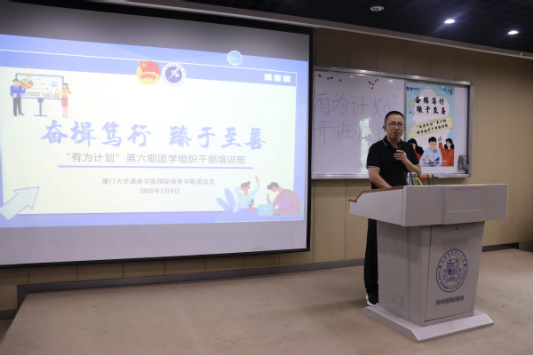 为深入贯彻落实党的二十大和二十届二中、三中全会精神,进一步提升团学组织干部的综合素养与责任担当,培养新时代青年骨干力量,锻造一支信念坚定、能力突出、作风优良的学生骨干队伍,国际商务学院团委于5月9日12:30在经管#201举行“奋楫笃行,臻于至善——‘有为计划’第六期团学组织干部培训班”开班仪式暨第一讲。本次活动由厦门大学嘉庚学院思想政治理论教研部副教授邵长虎主讲,国际商务学院党总支副书记辛东亮,辅导员老师陈艺杰、张钰淋以及培训班全体成员共同参加。