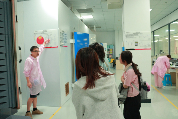 值得一提的是,参访团还近距离参观了此处的无线测试设备。该设备在福建省内仅有三家企业拥有,其先进的测试技术能够更精准地测试产品的无线通信性能、稳定性及兼容性,为产品质量提供了坚实保障。工作人员详细介绍了设备的技术参数、测试流程及应用方法等,让在场师生深切感受到企业在技术研发与质量管控方面的强大实力。