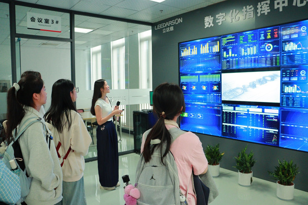 最后,师生们来到产业园指挥中心,观摩了立达信从订单接收、生产调度到物流发货的全流程数字化监控系统。该系统借助大数据、云计算等互联网技术,实现了生产运营全链条的可视化、智能化管理。工作人员可实时监控订单进度、设备状态、生产状况、物流信息等,确保生产全线高效协同。